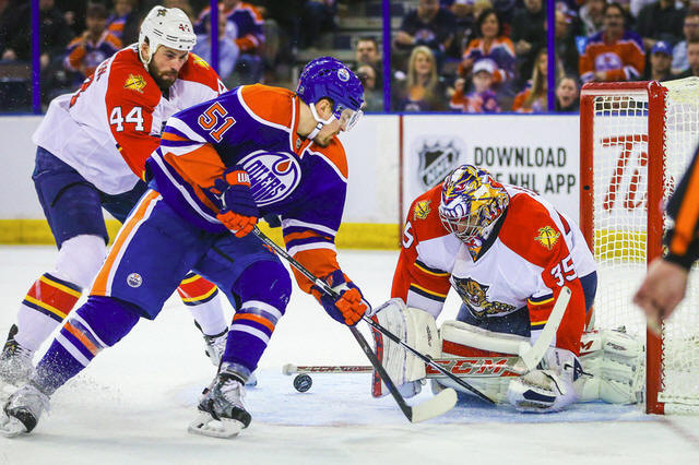 bore down on Oilers goalie Cam Talbot, but he still managed to slide