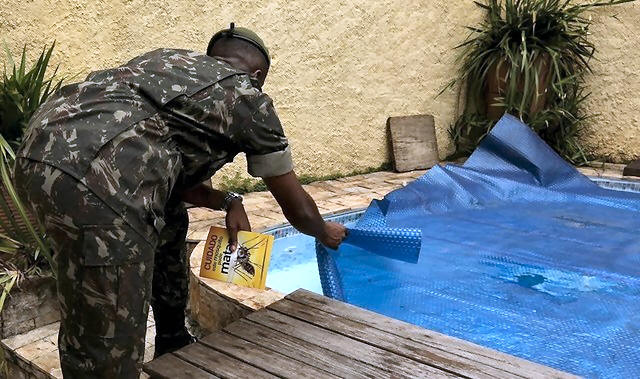 A Brazilian soldier searches for signs of mosquito larvae in a