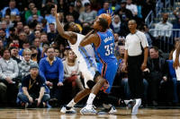 Thunder forward Kevin Durant (35) dribbles the ball as Denver