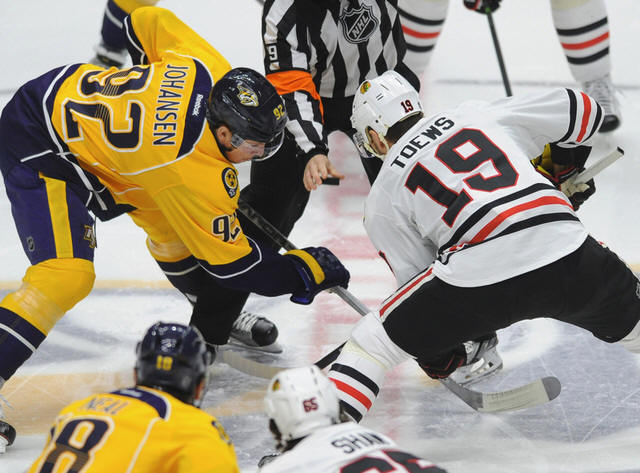 Predators center Ryan Johansen (92) and Chicago Blackhawks