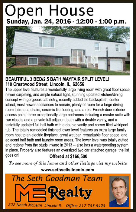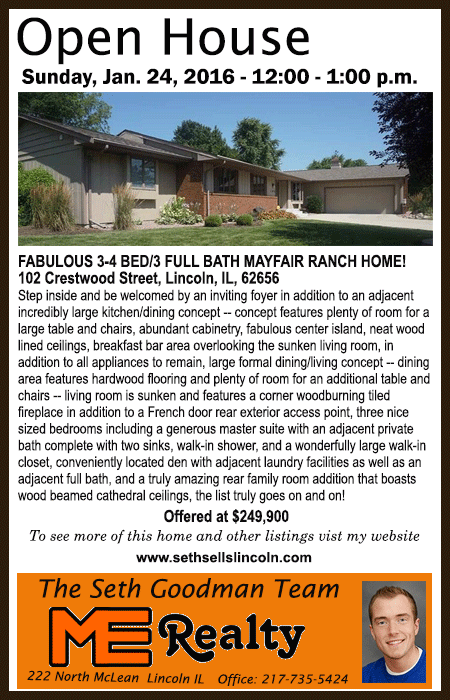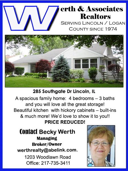 All real estate advertised in the Lincoln Daily News is subject to the Fair Housing Act for 1968 which makes it illegal to advertised "any preference, limitation, or discrimination based on race, color, religion, sex or national origin, or intention to make special preference, limitations, or discrimination."