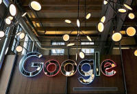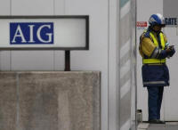 A construction worker stands near an AIG logo in Tokyo March 3,