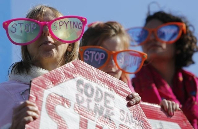 reading "Stop Spying" at the "Stop Watching Us: A Rally Against
