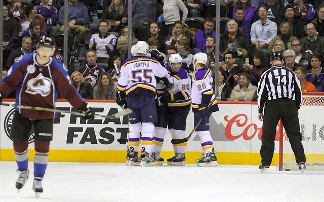 Blues left wing Alexander Steen (20) celebrates his goal in the