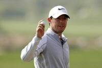 Northern Ireland's Rory McIlroy celebrates his eagle at the 18th