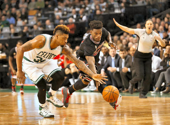 guard Marcus Smart (L) and Chicago Bulls guard Jimmy