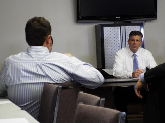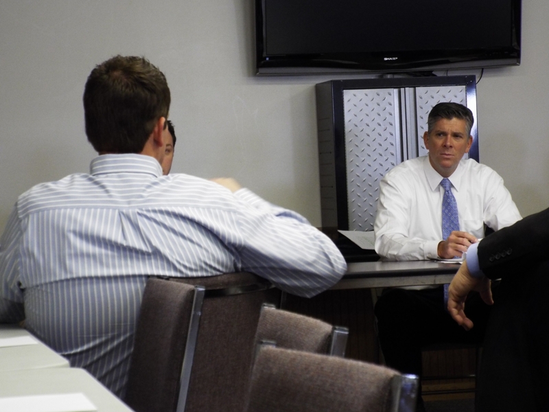 Darin LaHood listens to comments being made by a