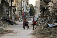 A girl pushes a boy on a bicycle past damaged buildings in