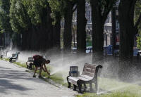 A man cools off in a water sprinkler in a park during a hot
