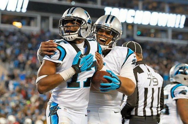 Panthers wide receiver Devin Funchess (17) and quarterback Cam