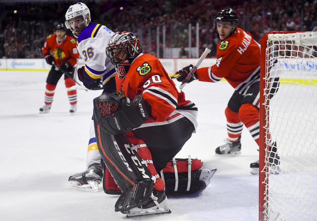 Blackhawks goalie Corey Crawford (50) looks for the puck against