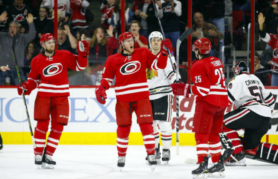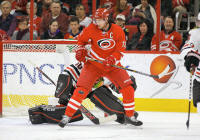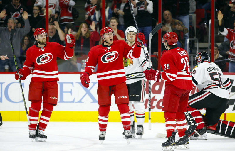 Hurricanes forward Eric Staal (12) screens the shot on Chicago