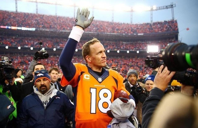 Broncos quarterback Peyton Manning (18) waves to the crowd after