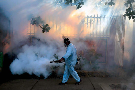 health ministry worker fumigates a house to kill mosquitoes during a campaign