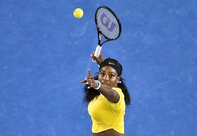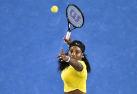 Serena Williams of the U.S. watches the ball as she hits a shot