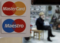 logo of MasterCard is seen on the door of a shoe shop in