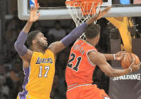 Lakers center Roy Hibbert (17) defends a shot by Chicago Bulls