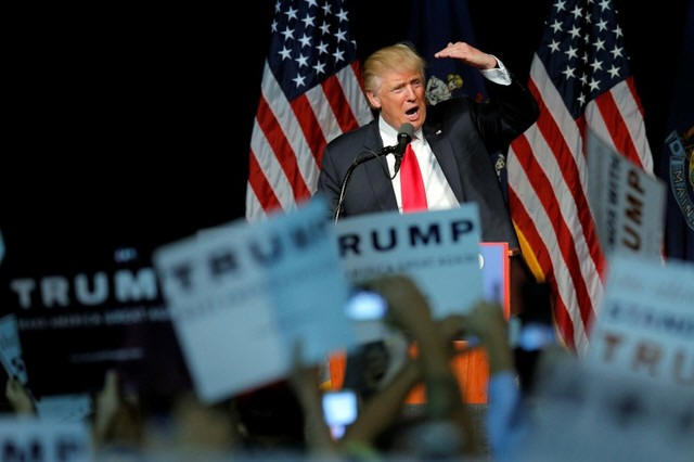Republican presidential candidate Donald Trump takes the stage at a