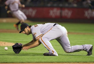 Bumgarner hits, pitches Giants past Athletics