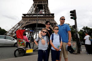 HomeAway contest for a night at the Eiffel Tower, pose as they arrive at