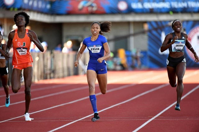 Shakima Wimbley (left) and Allyson Felix (middle) and Jessica Beard