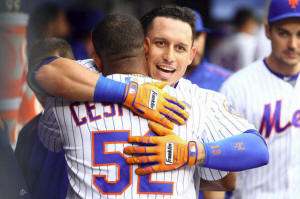 by New York Mets center fielder Yoenis Cespedes (52) after hitting a