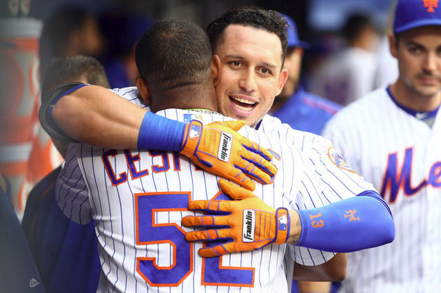 Mets shortstop Asdrubal Cabrera (13) is congratulated in the dugout