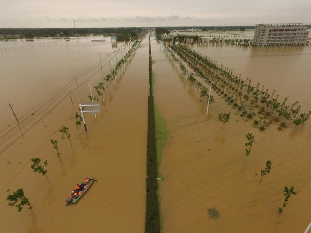 Rescuers take a boat to check around at a flooded road in Shucheng,