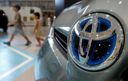 Visitors walk past a logo of Toyota Motor Corp on a Toyota Prius