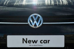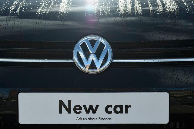 Signage for a new Volkswagen car is seen at a dealership in London,