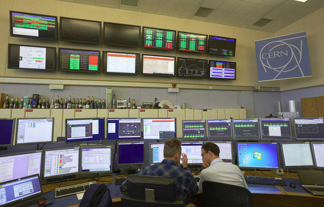 Technicians work in the Control Centre of the Large Hadron Collider