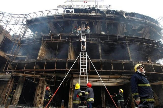 Firemen inspect the site of a suicide car bomb in the Karrada