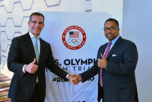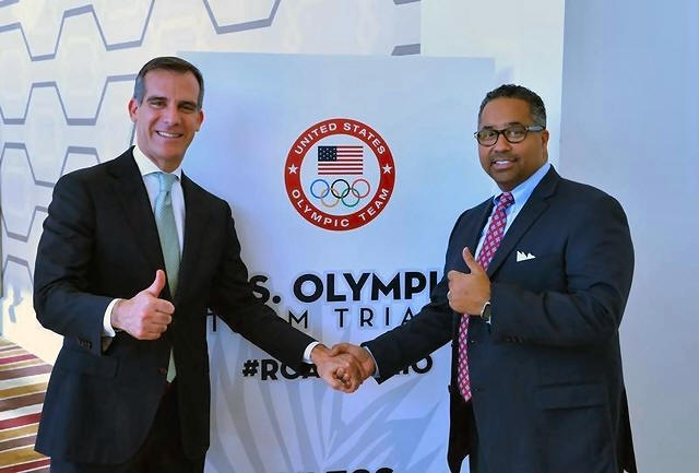 City of Los Angeles mayor Eric Gracetti (left) and USA Track & Field
