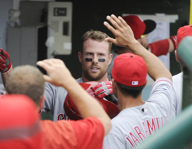 Reds shortstop Zack Cozart (2) celebrates in the dugout after his