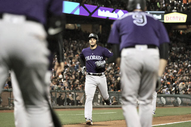 Nolan Arenado (28) is greeted at home plate after hitting a three