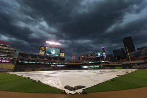 The Minnesota Twins and Oakland Athletics game is under a rain delay