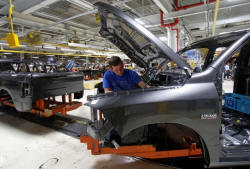a 2014 Ram 1500 pickup truck on the assembly line at the Warren