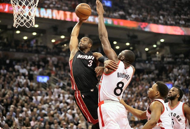 Heat guard Dwyane Wade (3) goes to the basket but is denied by