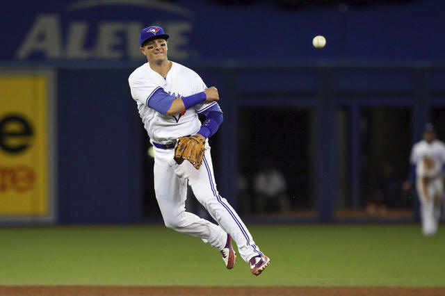 Jays shortstop Troy Tulowitzki (2) makes the throw to first in the