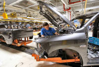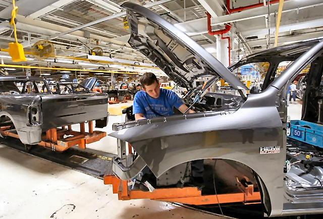 of a 2014 Ram 1500 pickup truck on the assembly line at the