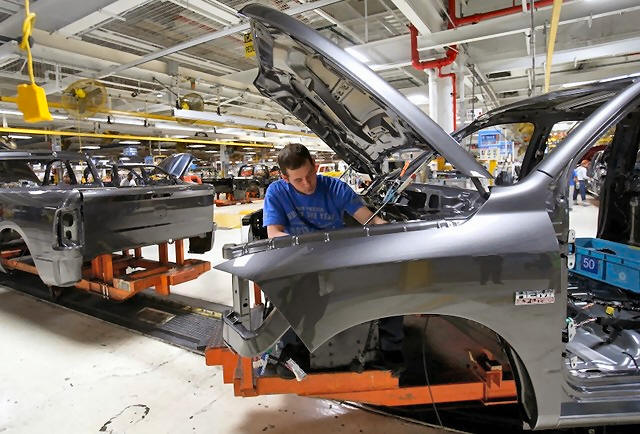 a 2014 Ram 1500 pickup truck on the assembly line at the Warren