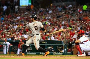 Giants first baseman Brandon Belt (9) hits a one-run single off of