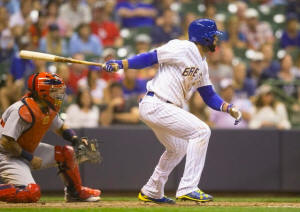 Brewers shortstop Jonathan Villar (5) drives in the winning run