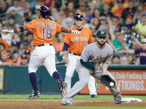 Astros third baseman Luis Valbuena (18) beats the throw to Oakland