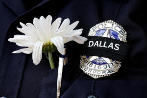 A Dallas police officer wears a custom mourning band and a flower at