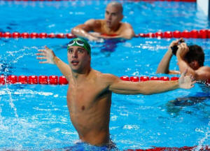 South Africa's Chad le Clos celebrates gold in the men's 100m