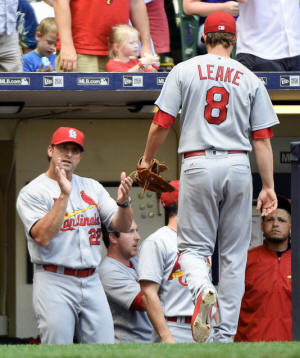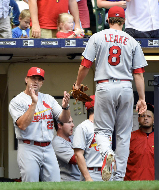 Cardinals pitcher Mike Leake (8) is greeted by manager Mike Matheny