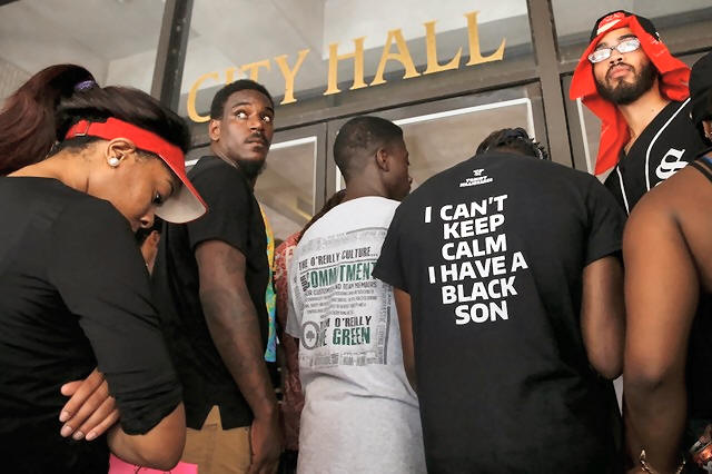 Demonstrators stand in front of the East Baton Rouge Parish City