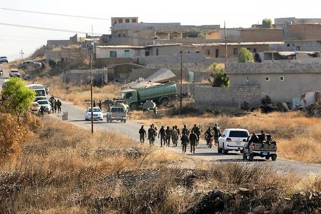 Kurdish Peshmerga forces gather in a village east of Mosul, Iraq,