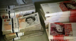 Wads of British Pound Sterling banknotes are stacked in piles at the